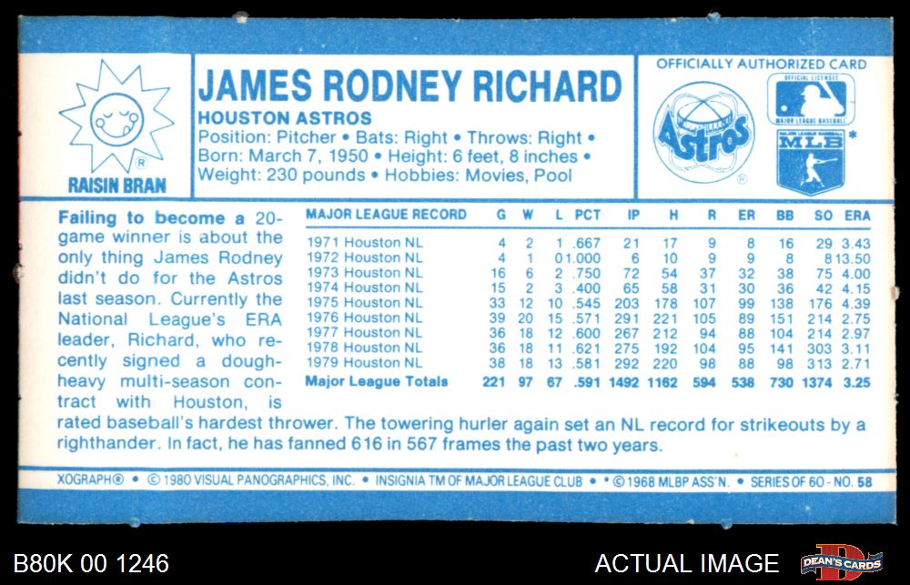 1980 Kelloggs #58 J.R. Richard 7 - NM