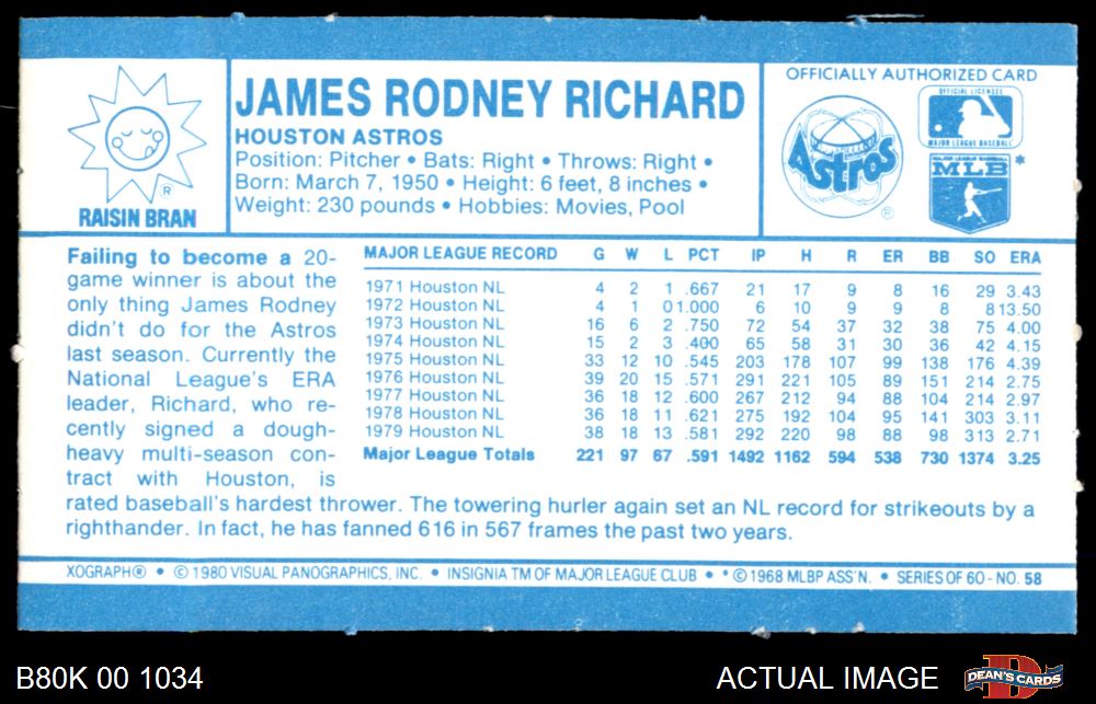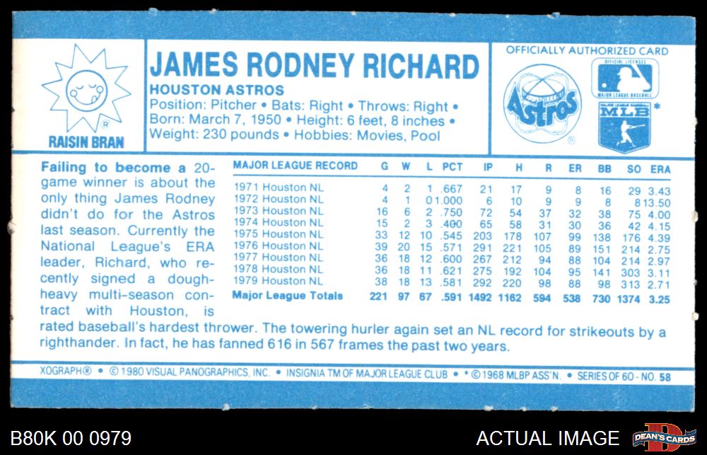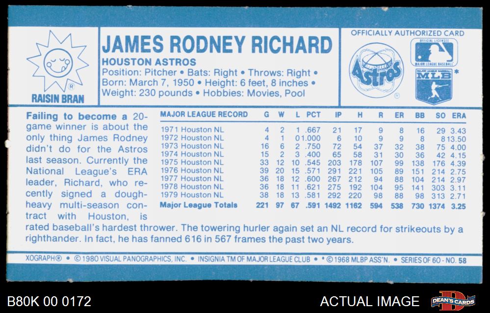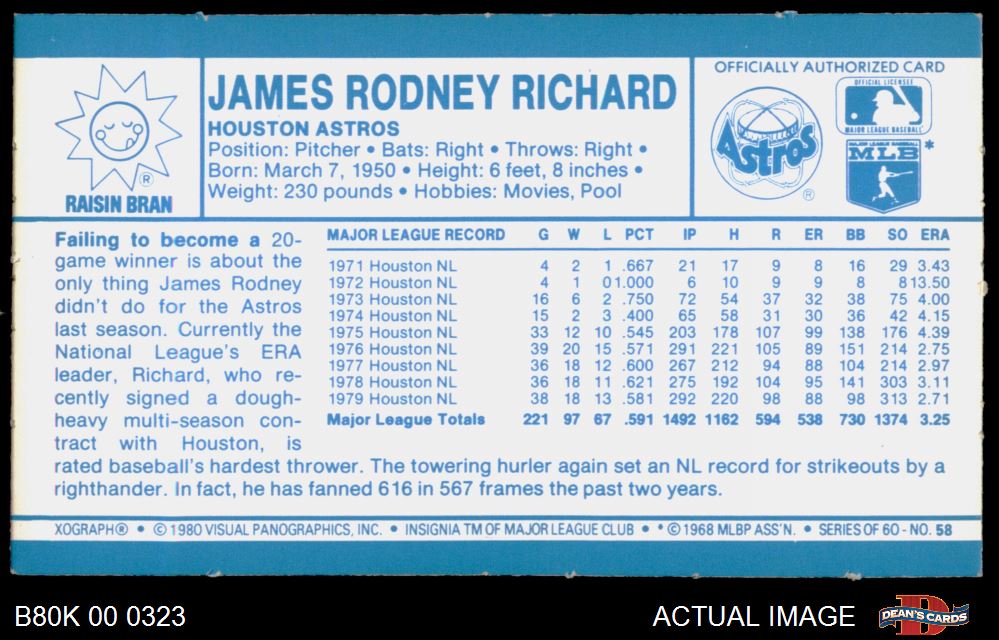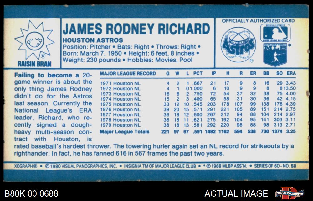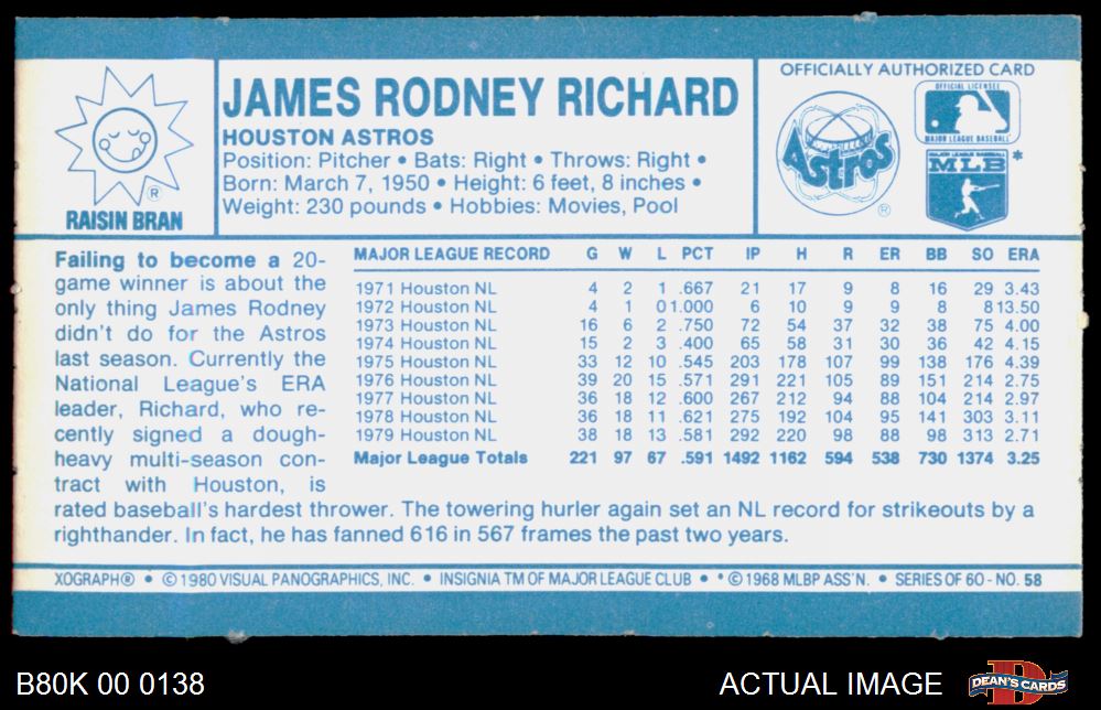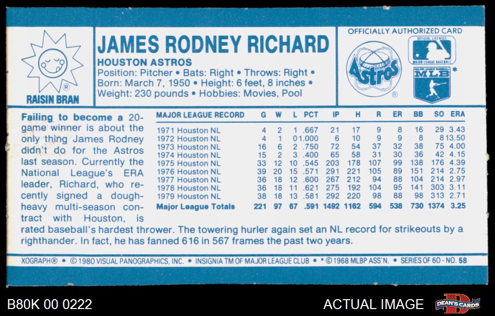 1980 Kelloggs #58 J.R. Richard 8 - NM/MT