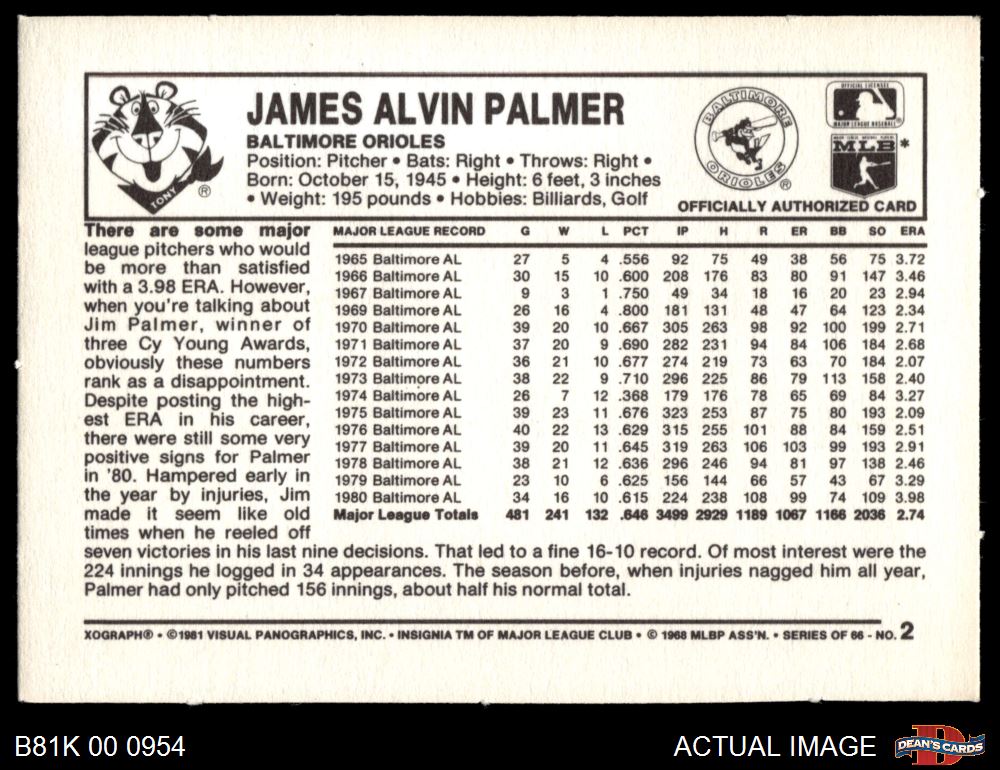 1981 Kelloggs #2 Jim Palmer 8 - NM/MT