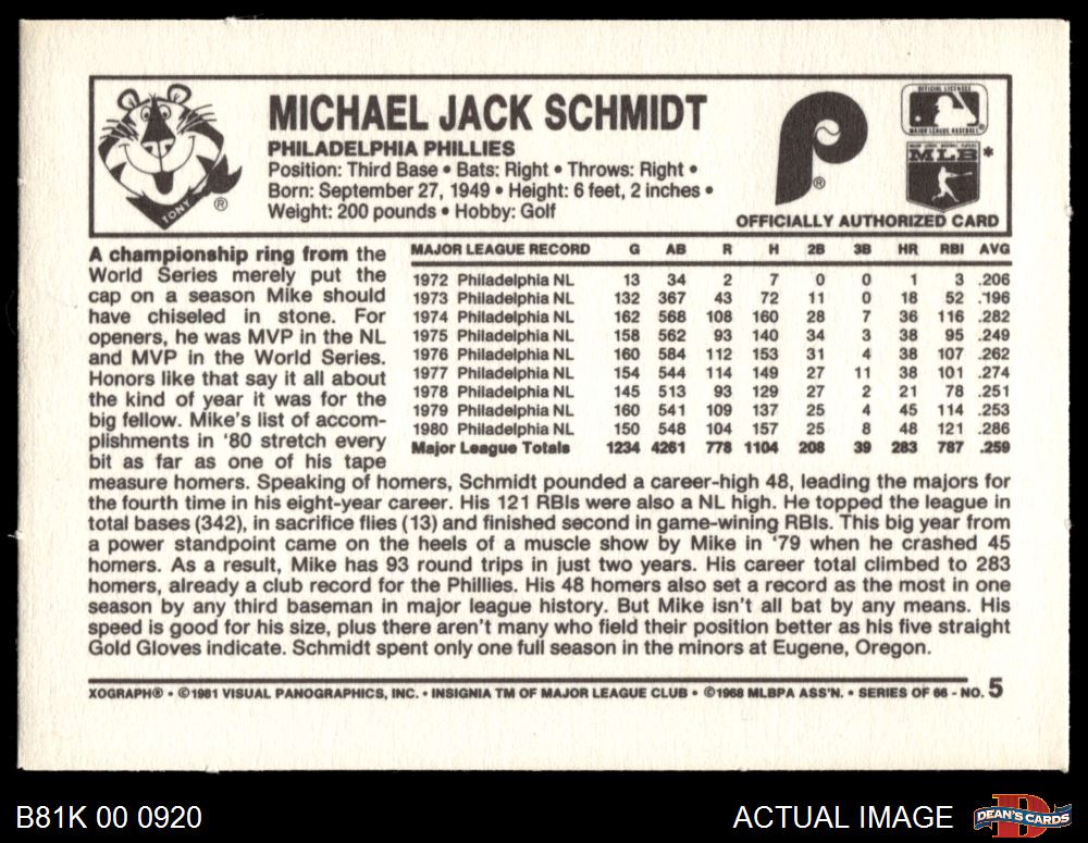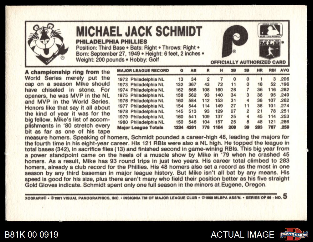 1981 Kelloggs #5 Mike Schmidt 6 - EX/MT