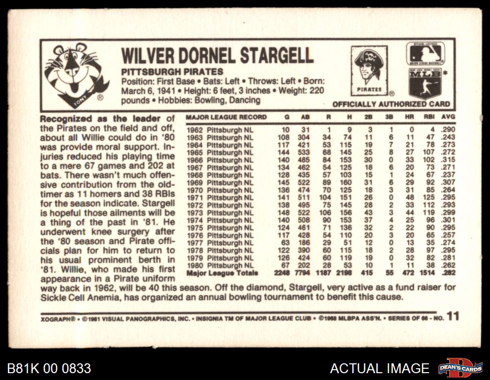 1981 Kelloggs #11 Willie Stargell 6 - EX/MT