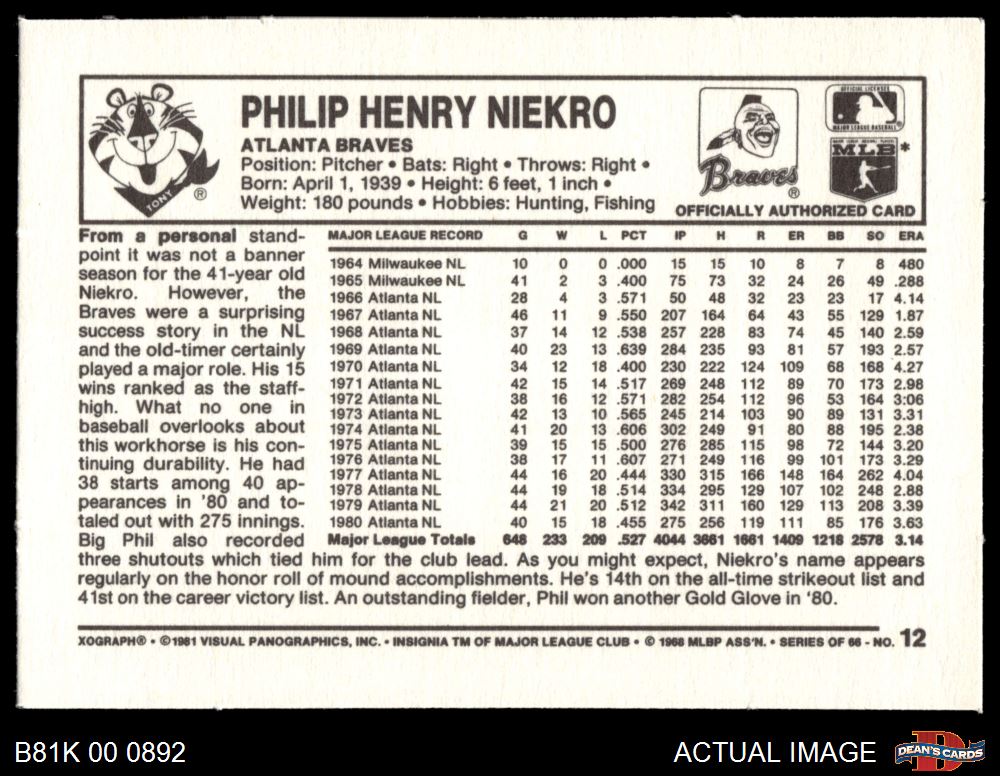 1981 Kelloggs #12 Phil Niekro 8 - NM/MT