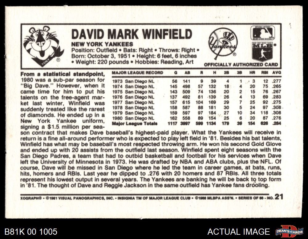 1981 Kelloggs #21 Dave Winfield 6.5 - EX/MT+