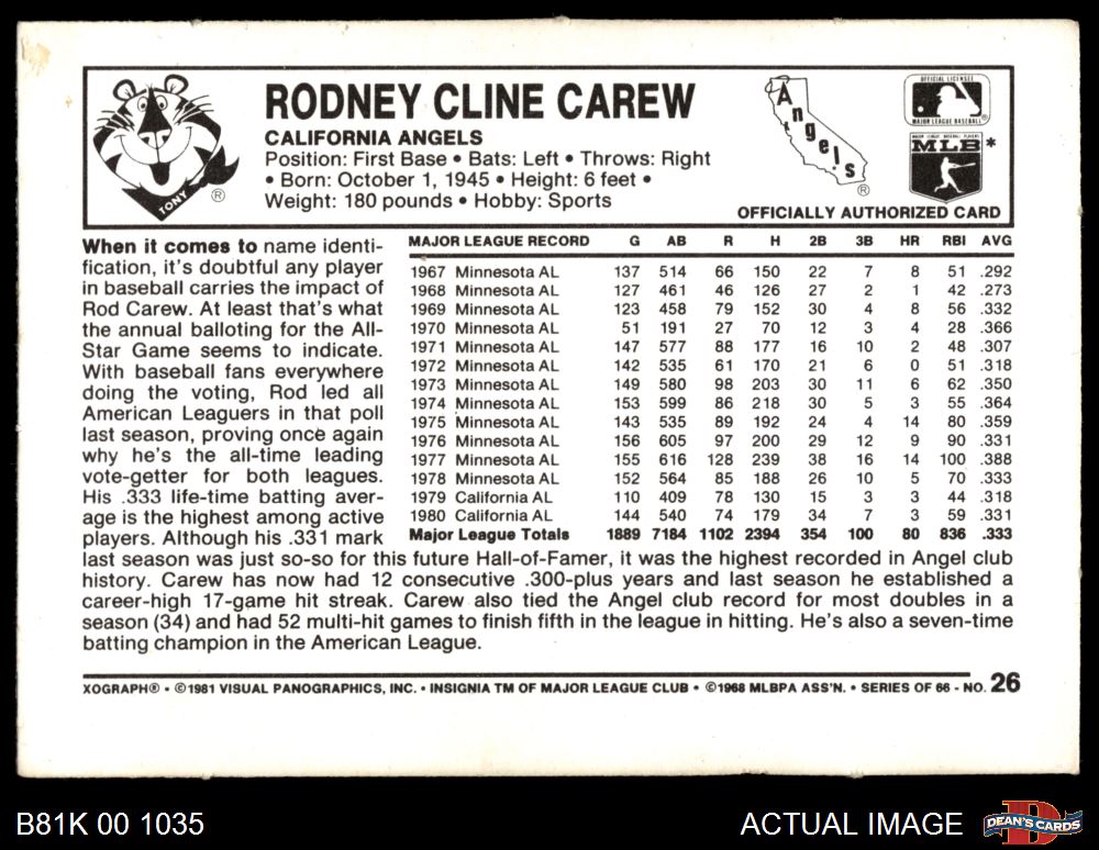 1981 Kelloggs #26 Rod Carew 4 - VG/EX