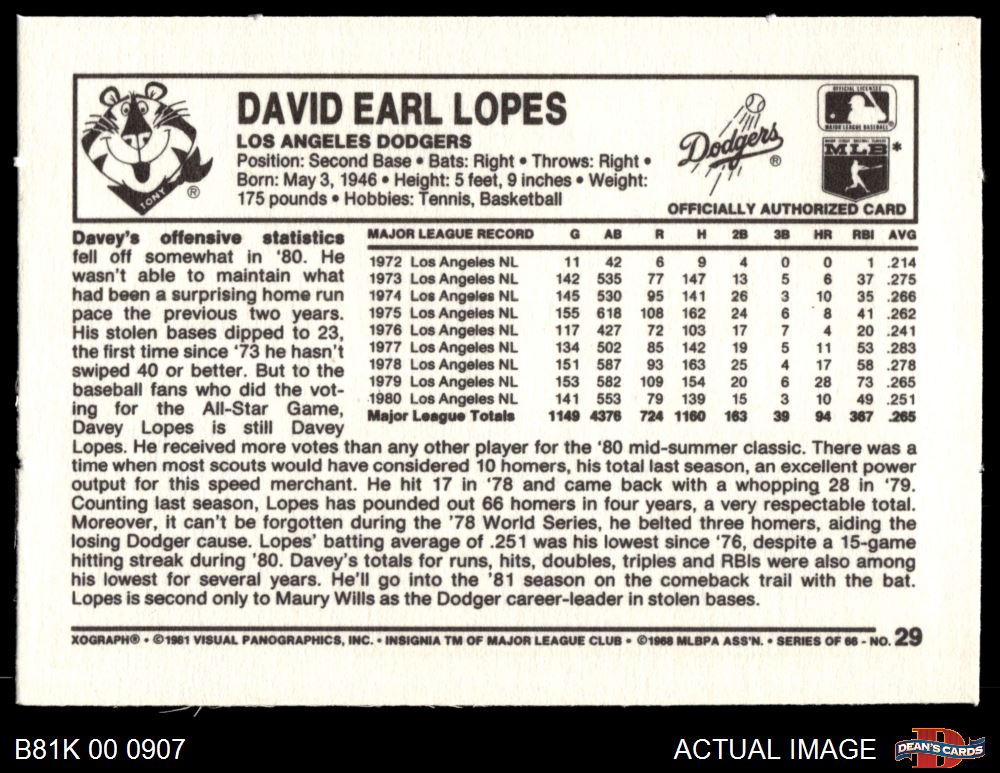 1981 Kelloggs #29 Davey Lopes 8 - NM/MT
