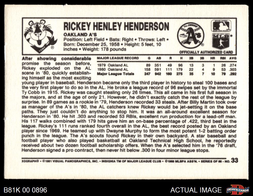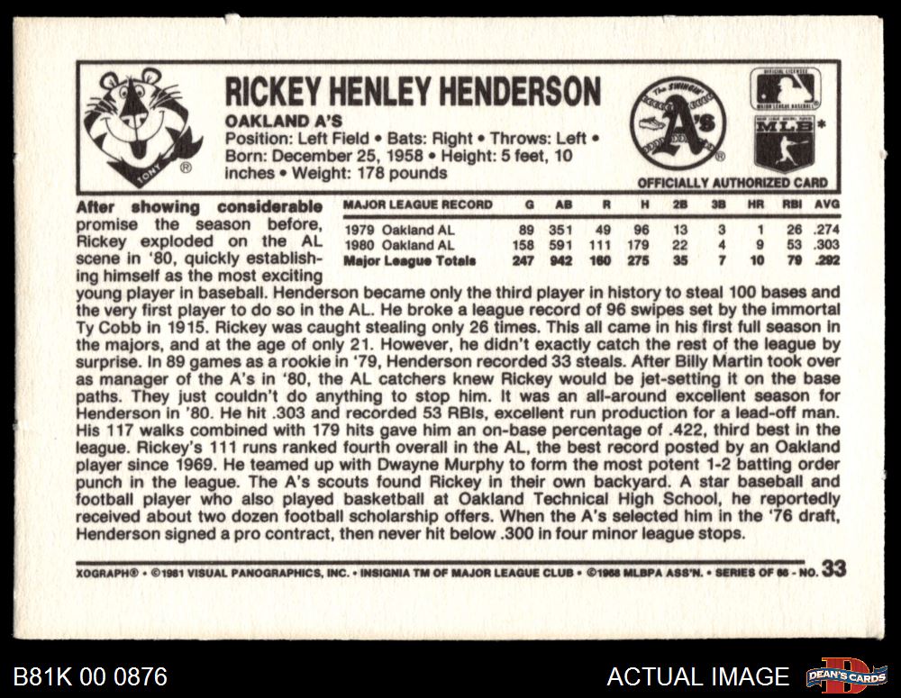 1981 Kelloggs #33 Rickey Henderson 5 - EX