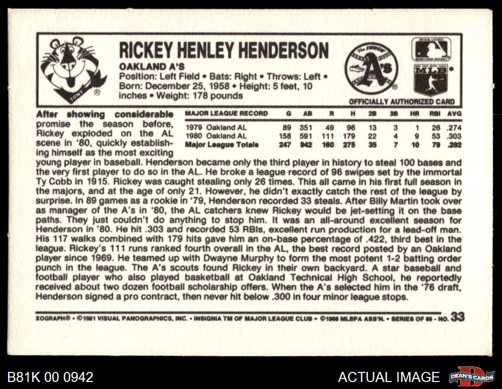 1981 Kelloggs #33 Rickey Henderson 8 - NM/MT