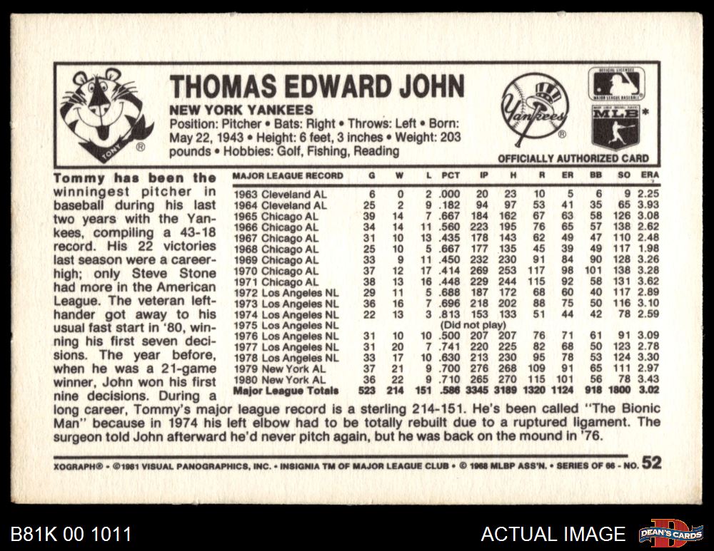 1981 Kelloggs #52 Tommy John