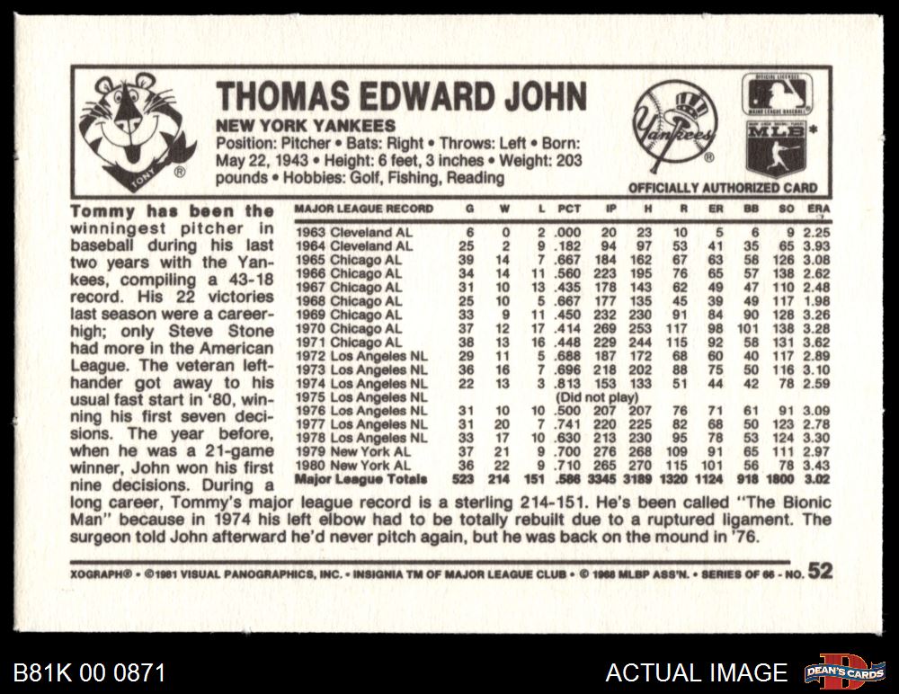 1981 Kelloggs #52 Tommy John 7 - NM