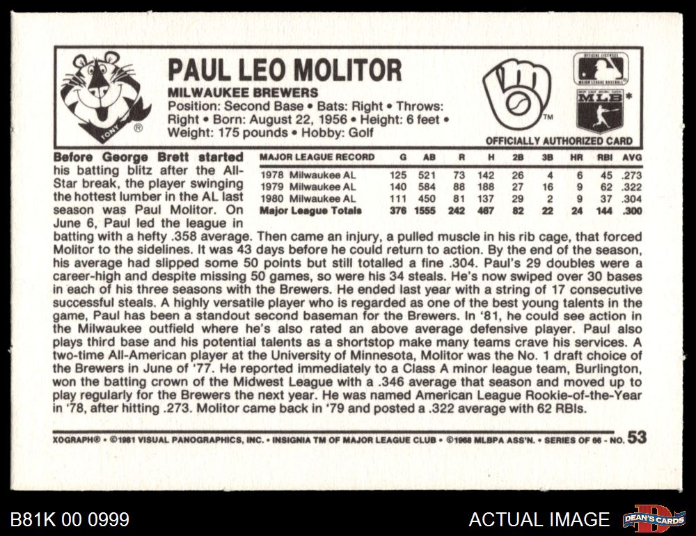 1981 Kelloggs #53 Paul Molitor