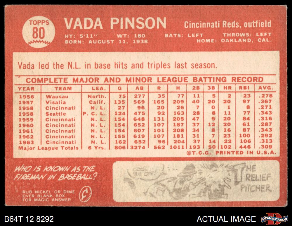 1964 Topps #80 Vada Pinson 2 - GOOD