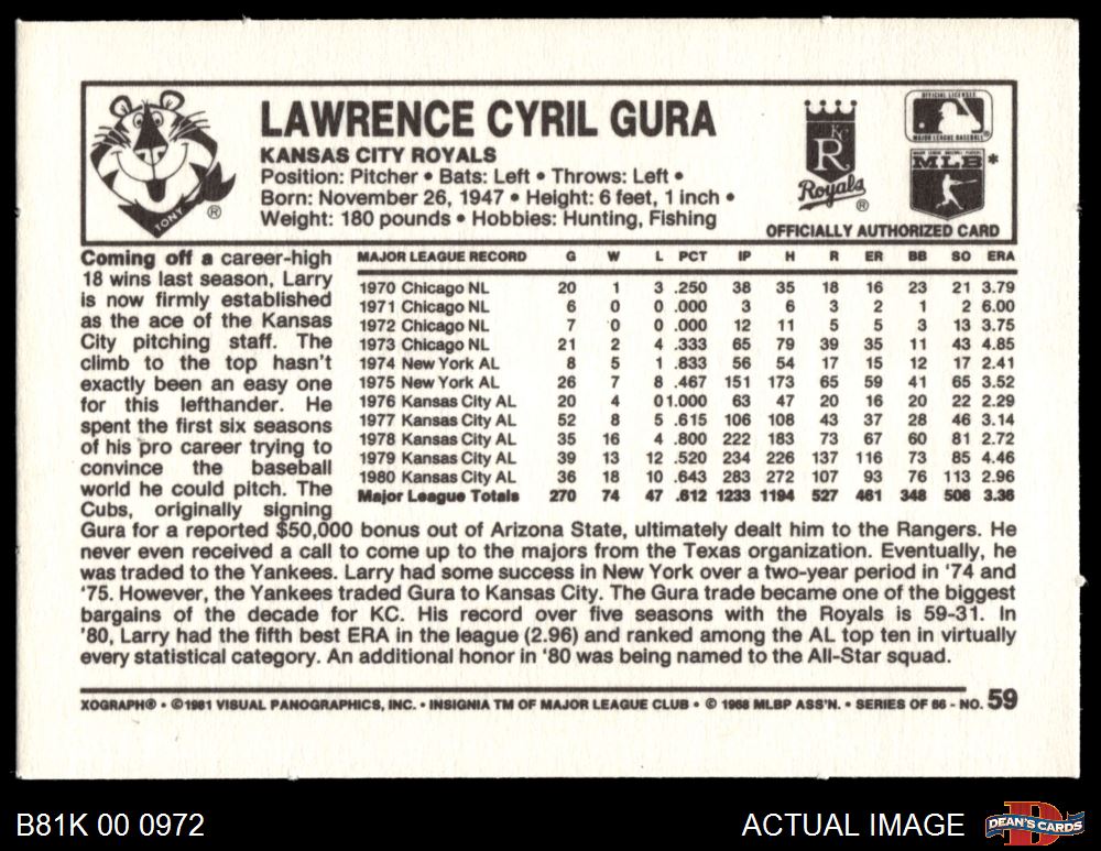 1981 Kelloggs #59 Larry Gura 7.5 - NM+