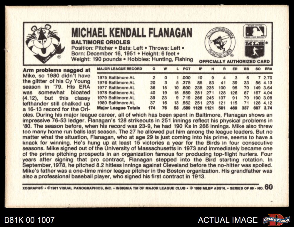 1981 Kelloggs #60 Mike Flanagan 5 - EX