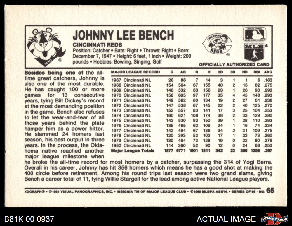 1981 Kelloggs #65 Johnny Bench 7 - NM