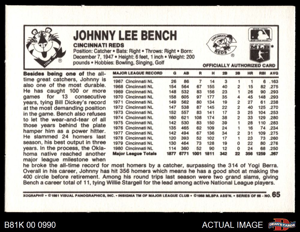 1981 Kelloggs #65 Johnny Bench 8 - NM/MT