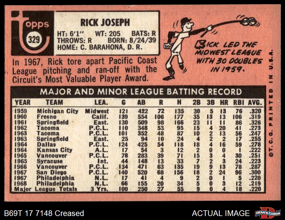1969 Topps #329 Rick Joseph 3 - VG