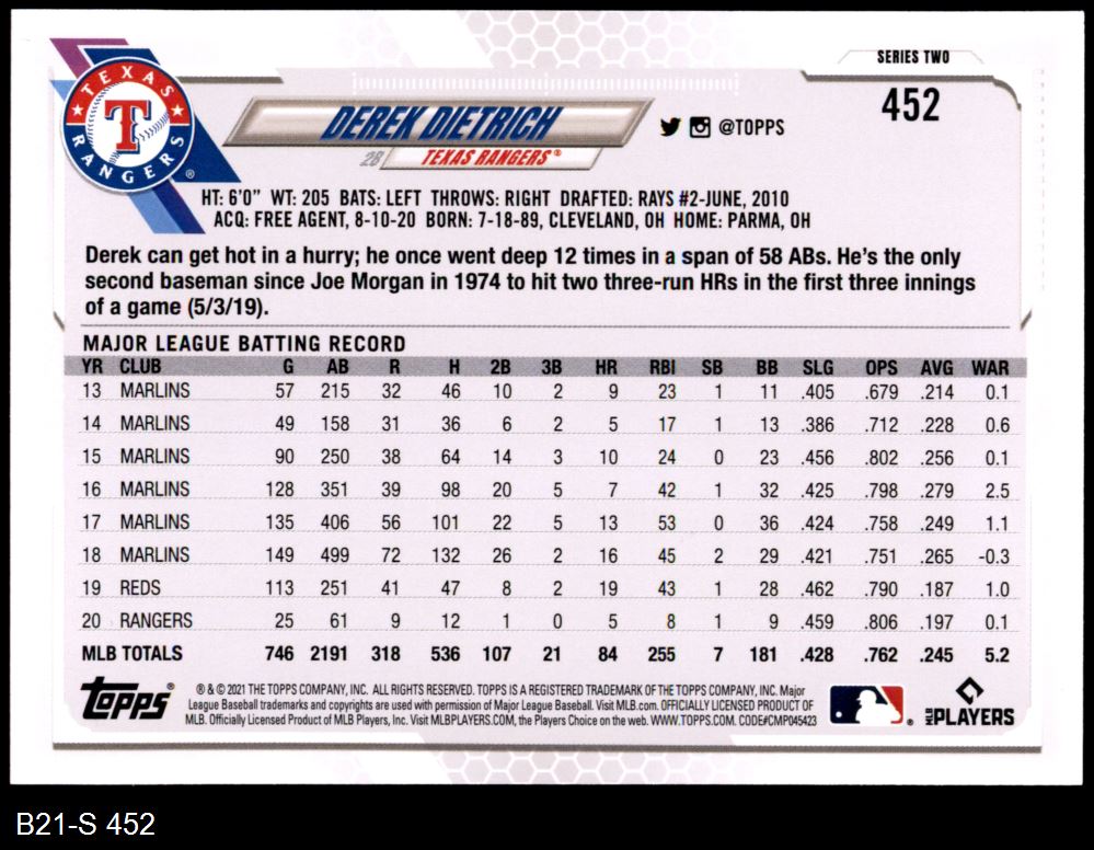 2021 Topps #452 Derek Dietrich 8 - NM/MT
