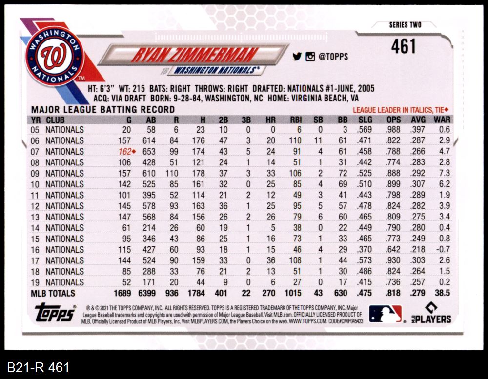 2021 Topps #461 Ryan Zimmerman 8 - NM/MT