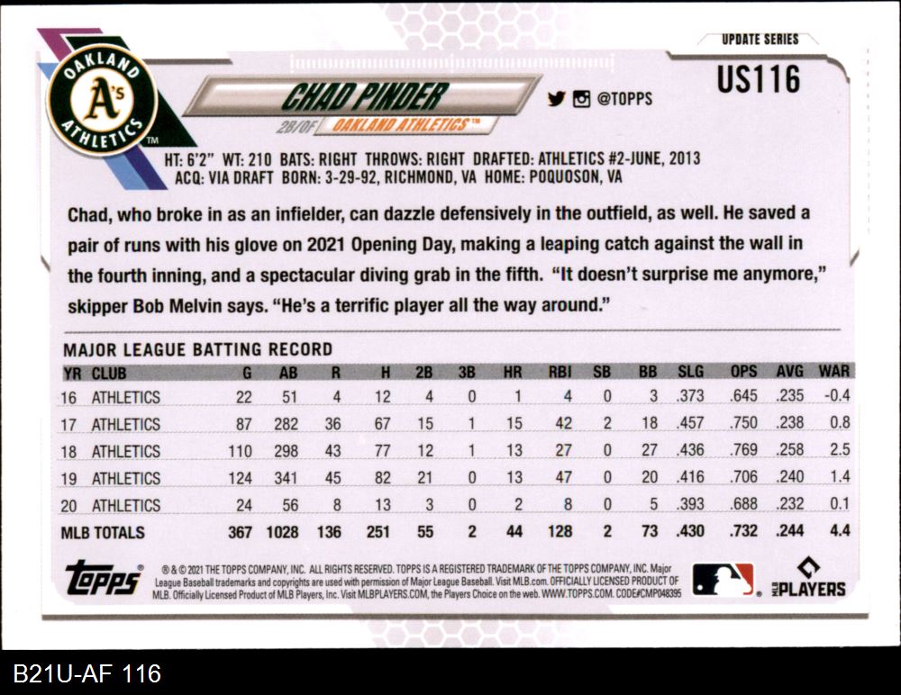 2021 Topps Update #116 Chad Pinder 8 - NM/MT