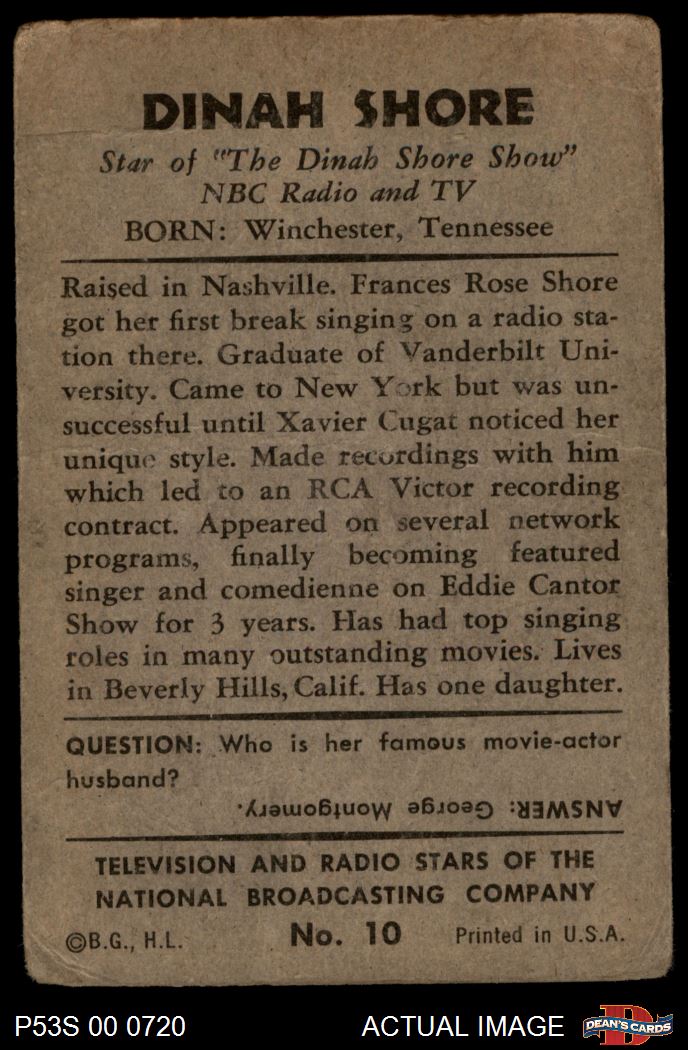 1953 Bowman T.V. & Radio NBC #10 Dinah Shore 1 - POOR