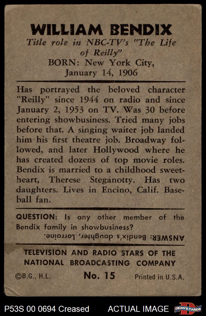 1953 Bowman T.V. & Radio NBC #15 William Bendix 2 - GOOD