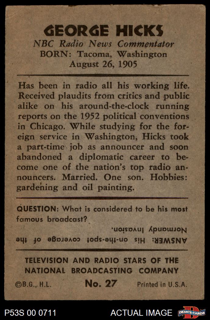 1953 Bowman T.V. & Radio NBC #27 George Hicks