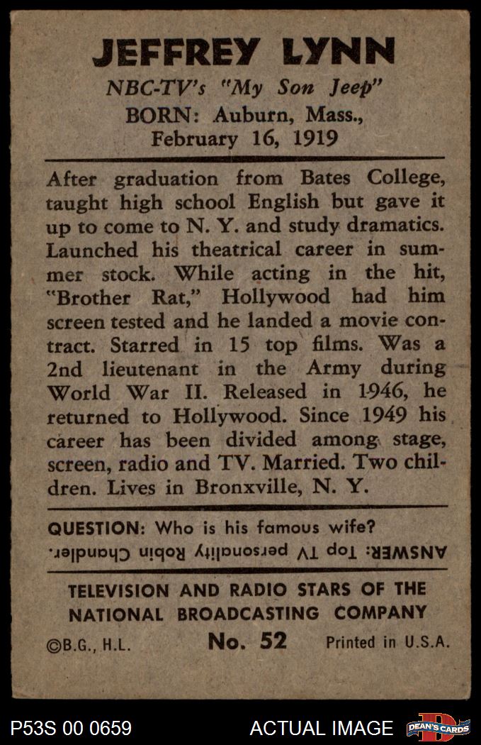 1953 Bowman T.V. & Radio NBC #52 Jeffrey Lynn 4 - VG/EX