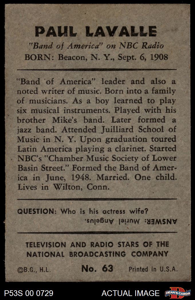 1953 Bowman T.V. & Radio NBC #63 Paul Lavalle 4 - VG/EX