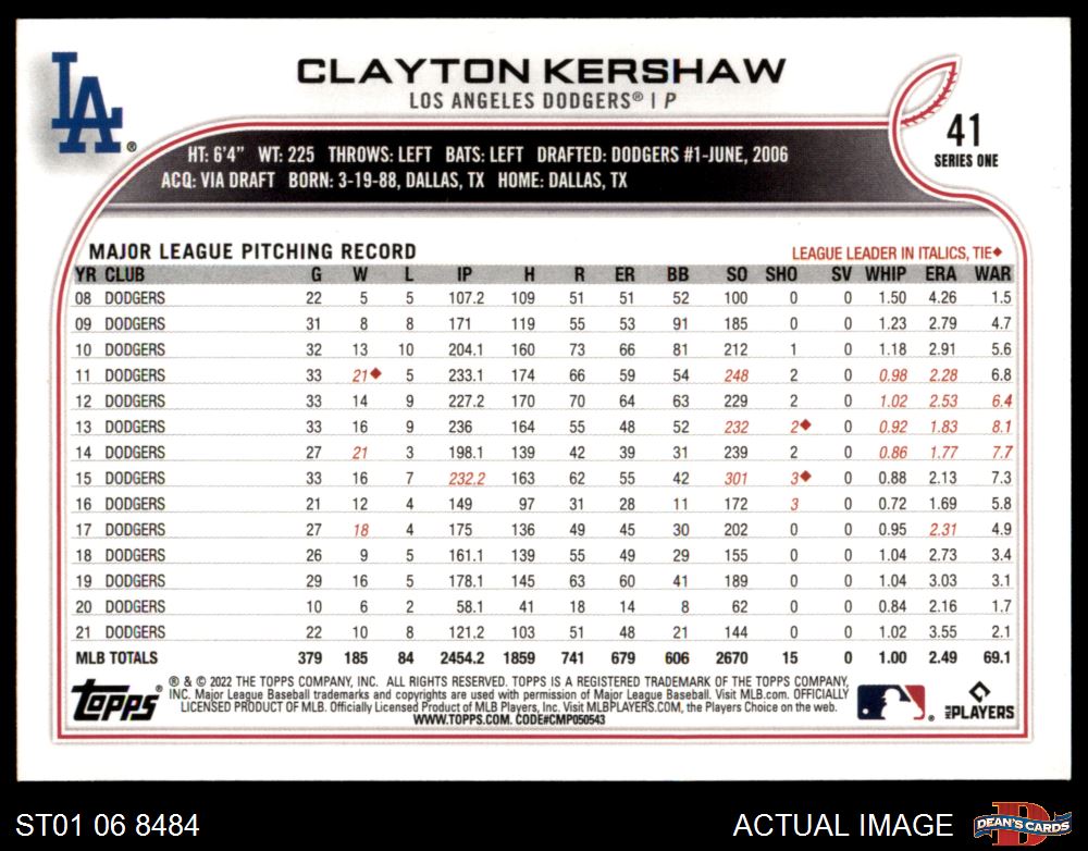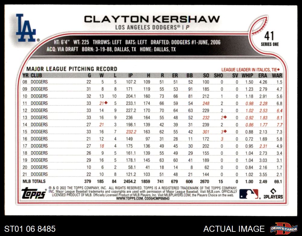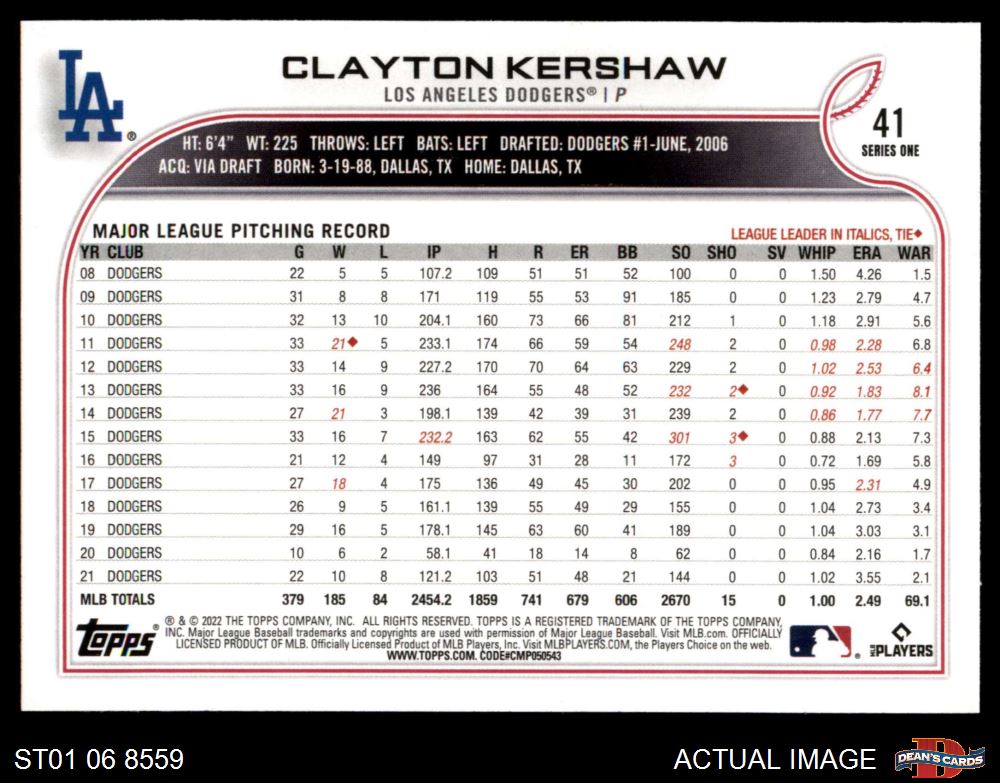 2022 Topps #41 A Clayton Kershaw 8 - NM/MT