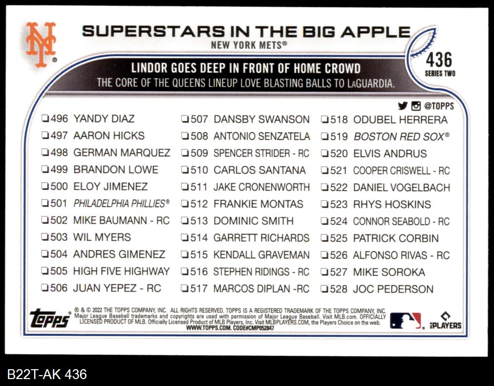 2022 Topps #436 Superstars In The Big Apple - Pete Alonso - Francisco Lindor - Checklist