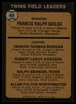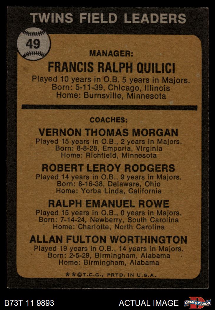 1973 Topps #49 ORG - Frank Quilici / Vern Morgan / Bob Rodgers / Ralph Rowe / Al Worthington Twins Leaders 6.5 - EX/MT+