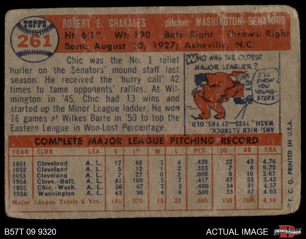 1957 Topps #261 Bob Chakales AUTHENTIC