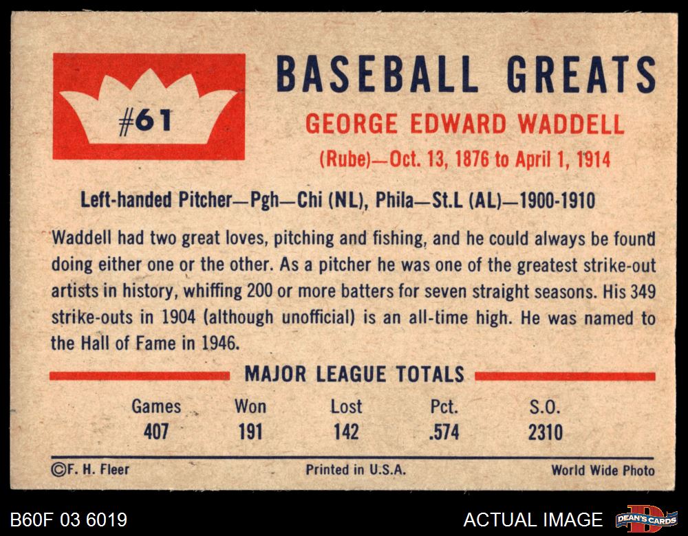 1960 Fleer #61 Rube Waddell 3 - VG