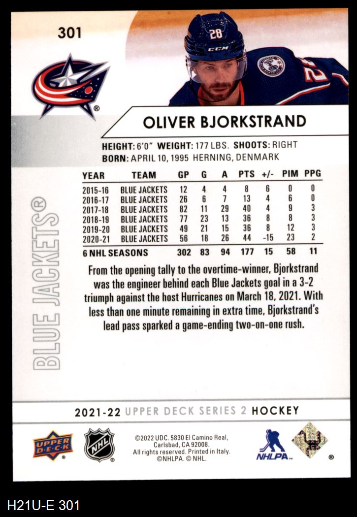 2021 Upper Deck #301 Oliver Bjorkstrand 8 - NM/MT