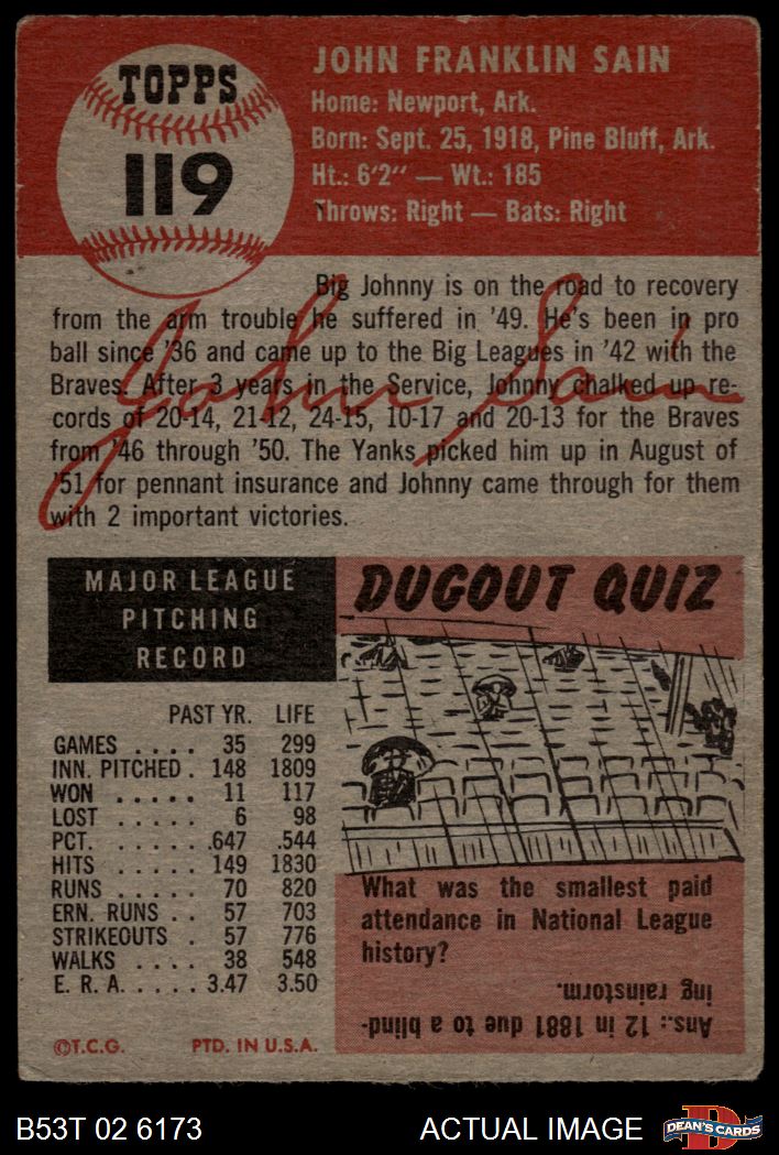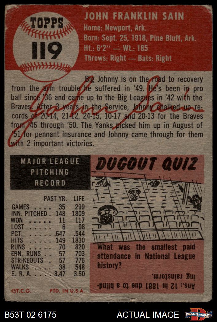 1953 Topps #119 Johnny Sain 1.5 - FAIR