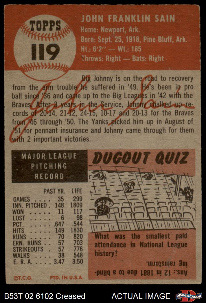 1953 Topps #119 Johnny Sain Front Thumbnail