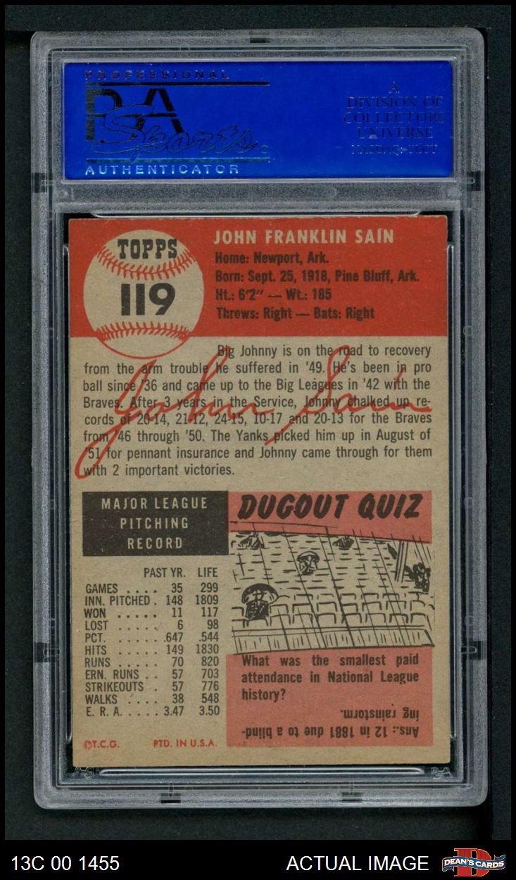 1953 Topps #119 Johnny Sain PSA 6 - EX/MT