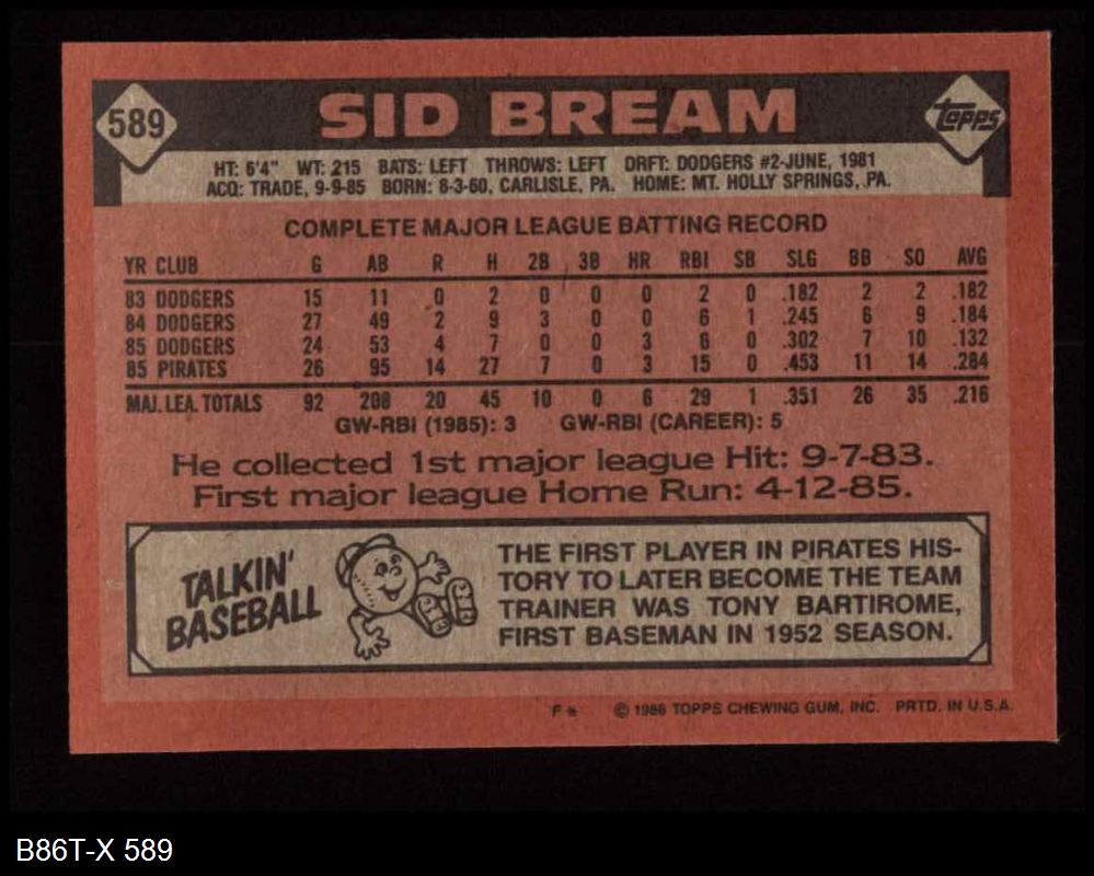 1986 Topps #589 Sid Bream 8 - NM/MT