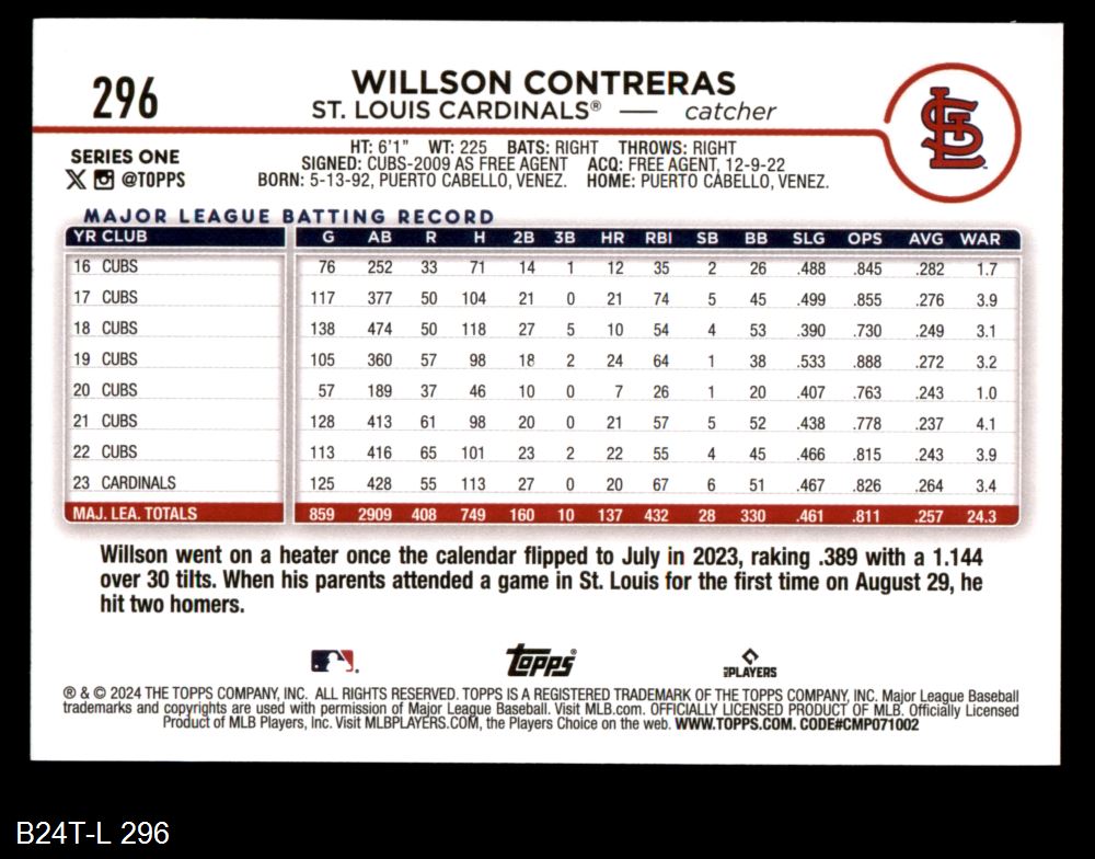 2024 Topps #296 Willson Contreras 8 - NM/MT