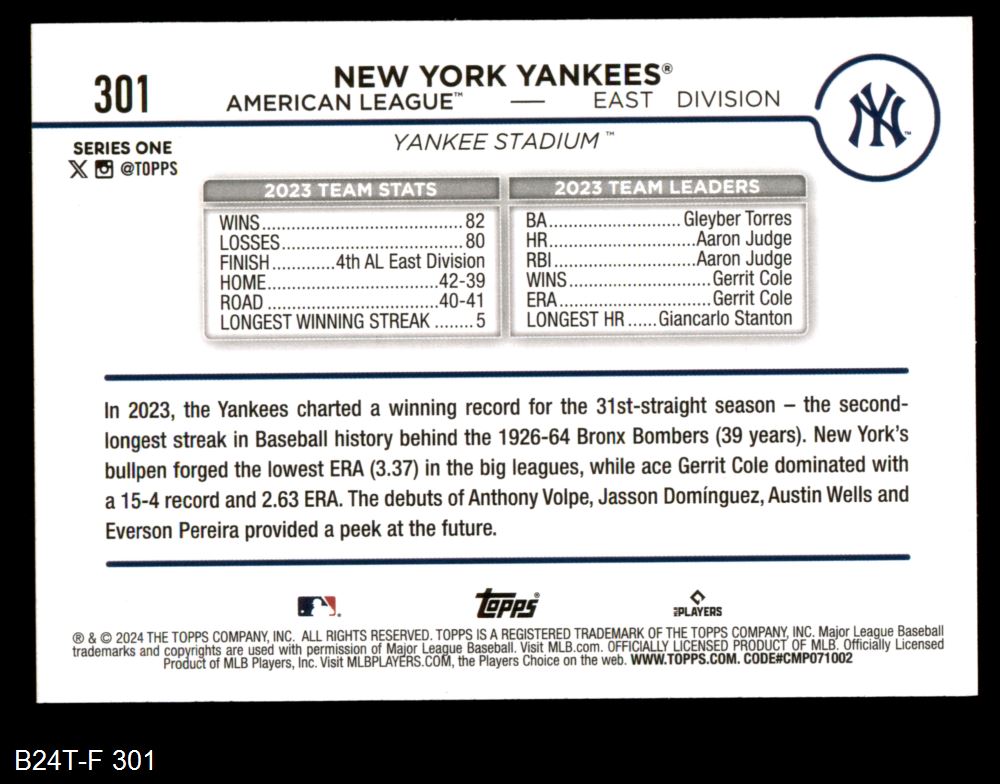 2024 Topps #301 New York Yankees Team