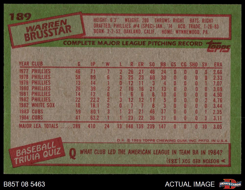 1985 Topps #189 Warren Brusstar