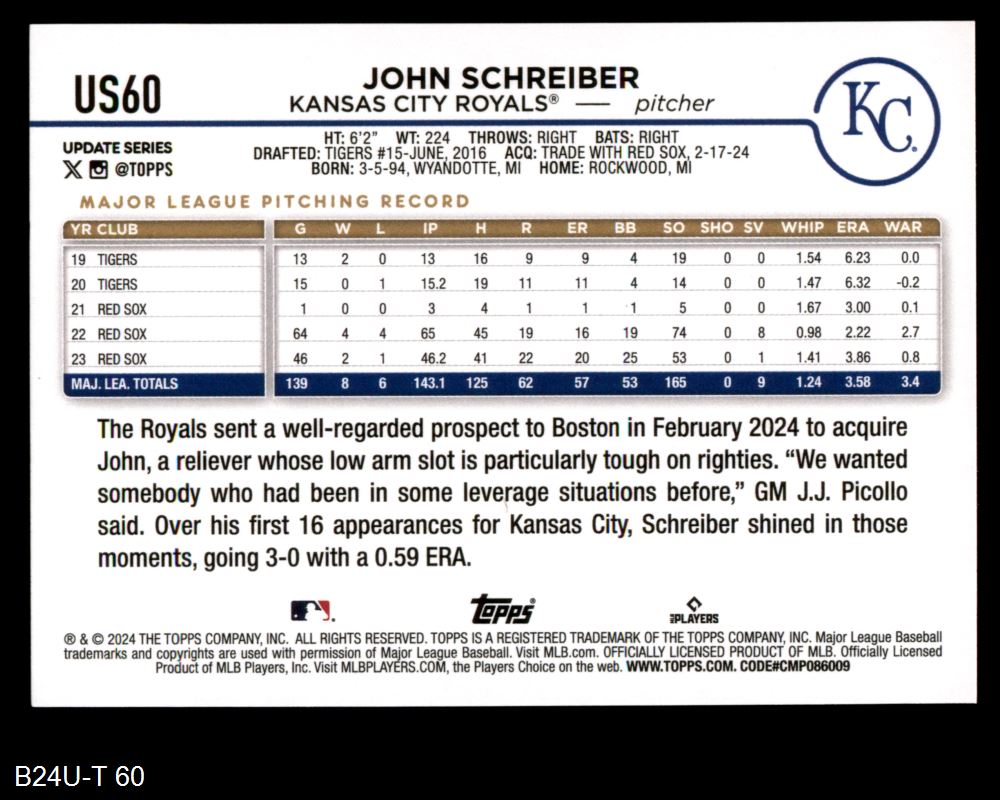 2024 Topps Update #60 John Schreiber 8 - NM/MT