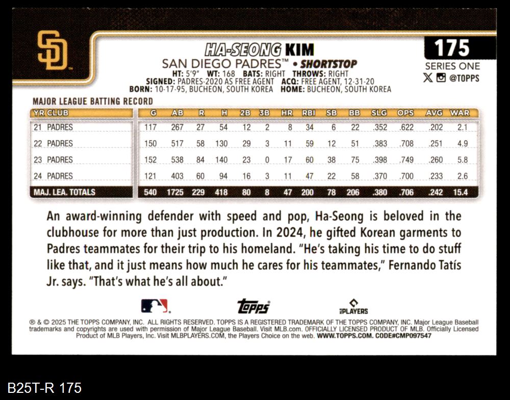 2025 Topps #175 Ha-Seong Kim 8 - NM/MT