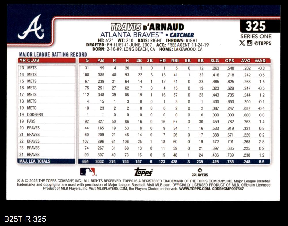 2025 Topps #325 Travis d'Arnaud 8 - NM/MT
