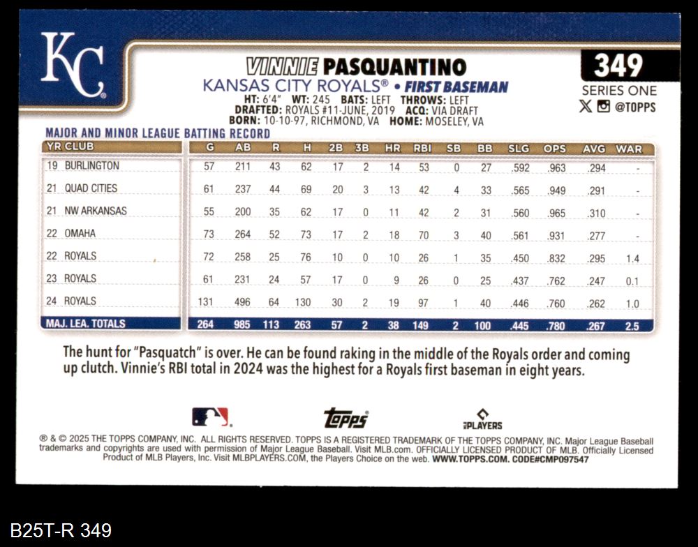 2025 Topps #349 Vinnie Pasquantino 8 - NM/MT