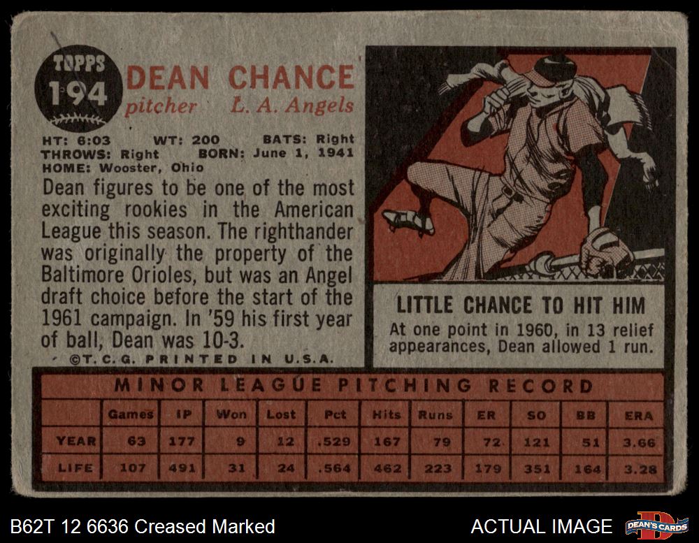 1962 Topps #194 NRM Dean Chance AUTHENTIC