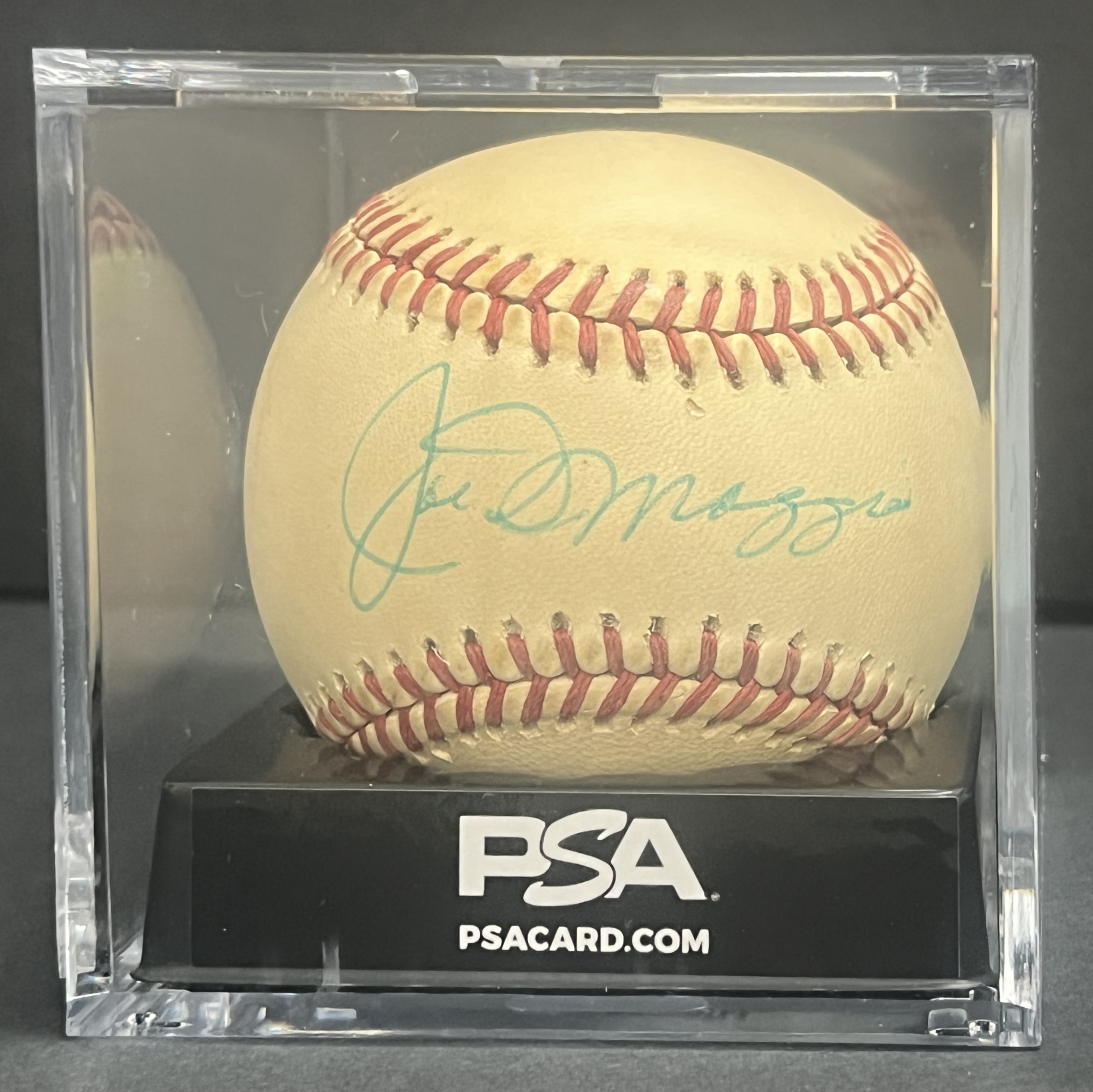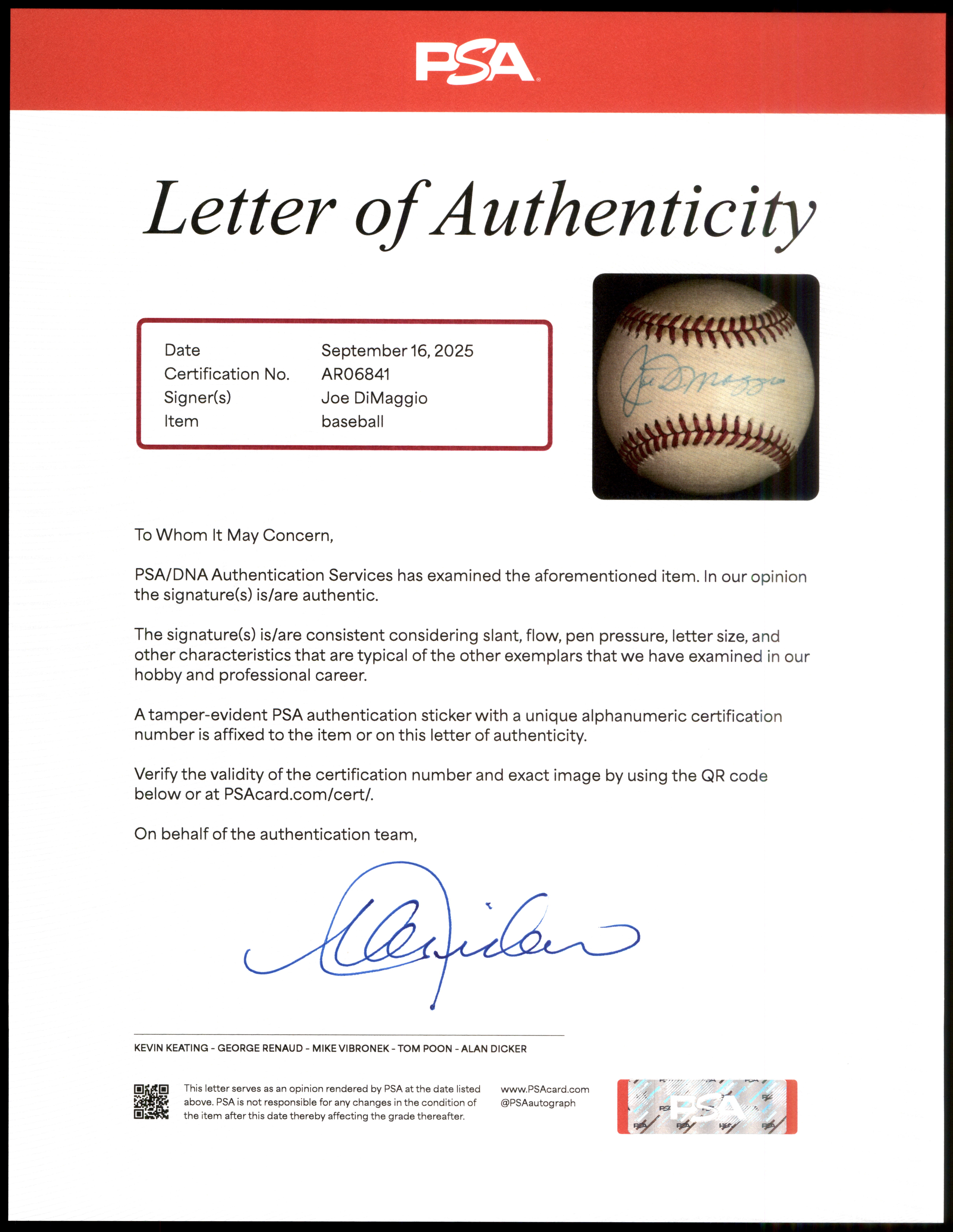 This Joe DiMaggio autographed baseball has been authenticated and encased by PSA and comes with the Letter of Authenticity pictured.