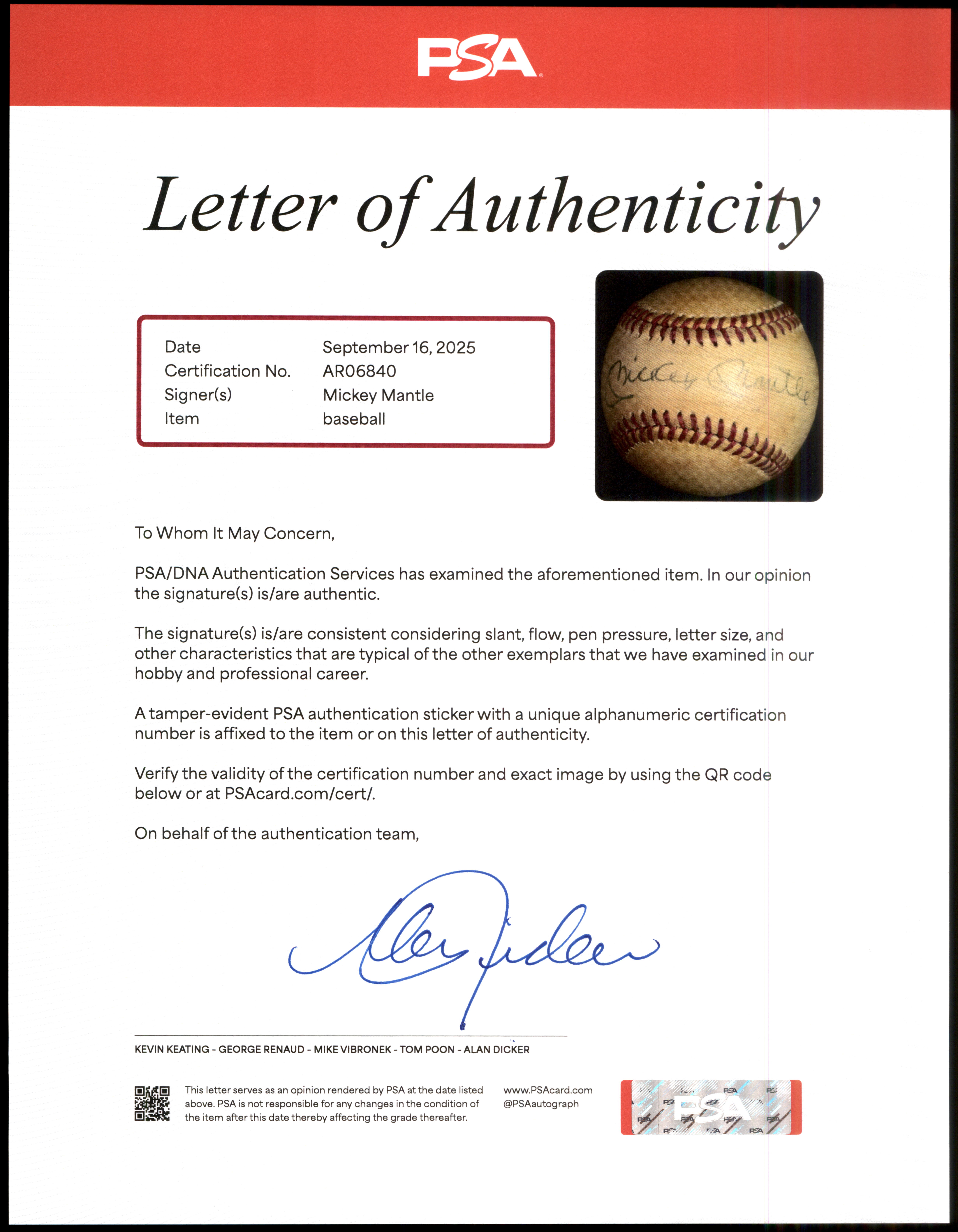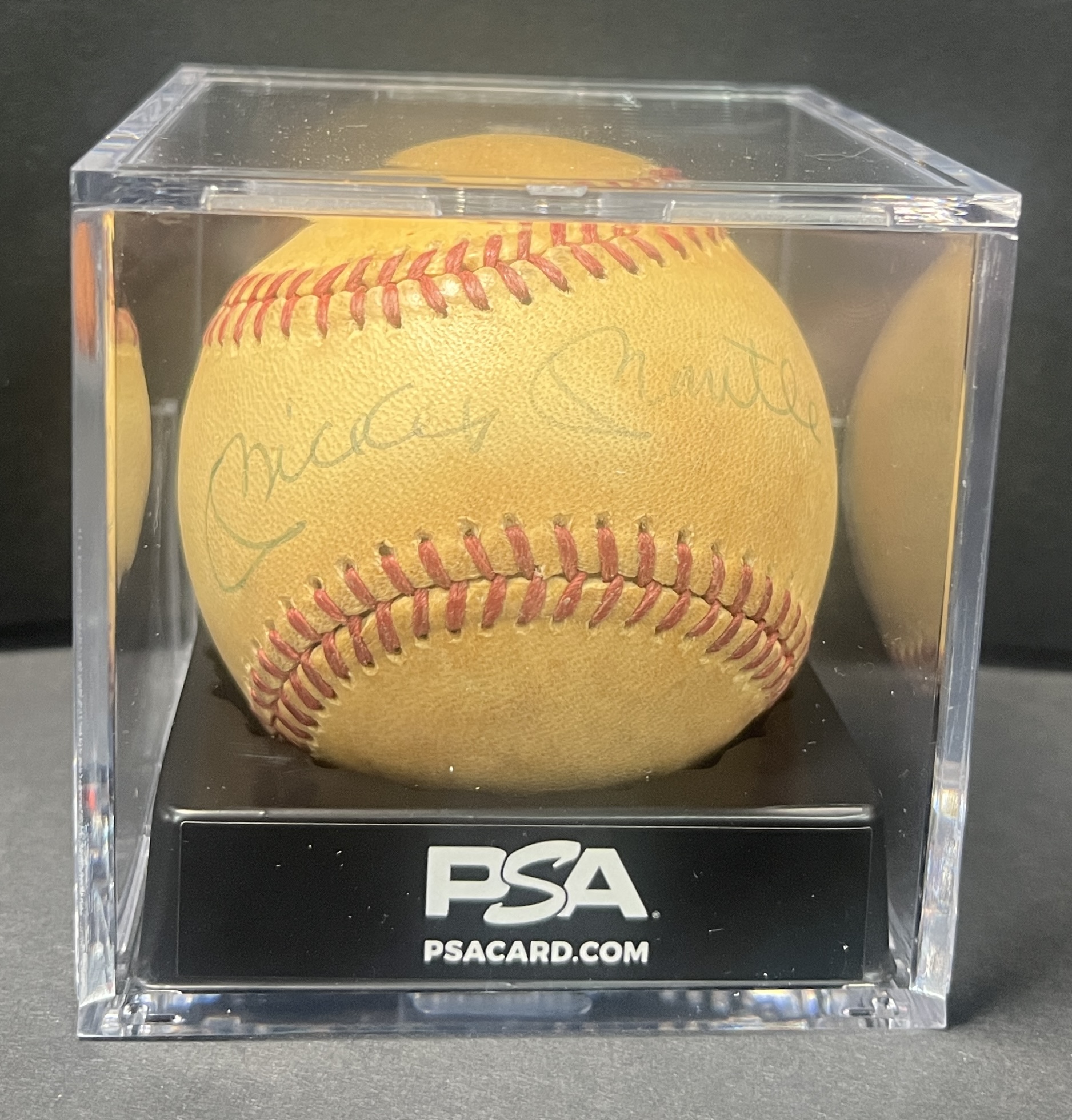 This Mickey Mantle autographed baseball has been authenticated and encased by PSA and comes with the Letter of Authenticity pictured.