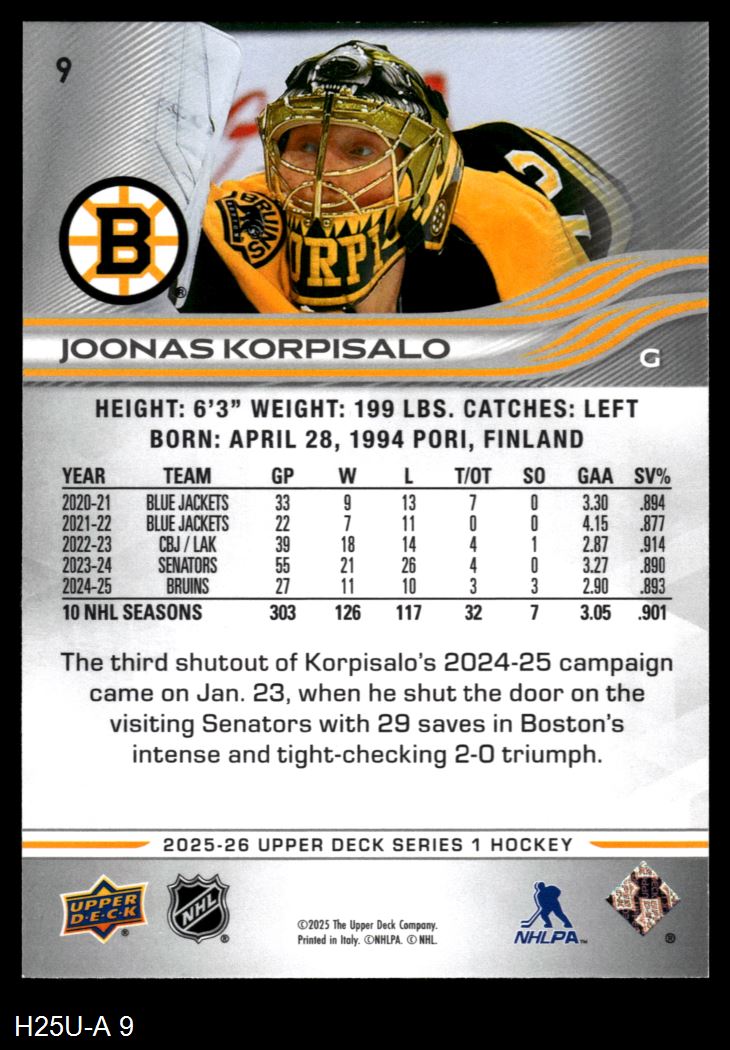 2025 Upper Deck #9 Joonas Korpisalo 8 - NM/MT