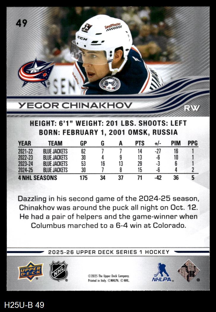 2025 Upper Deck #49 Yegor Chinakhov 8 - NM/MT